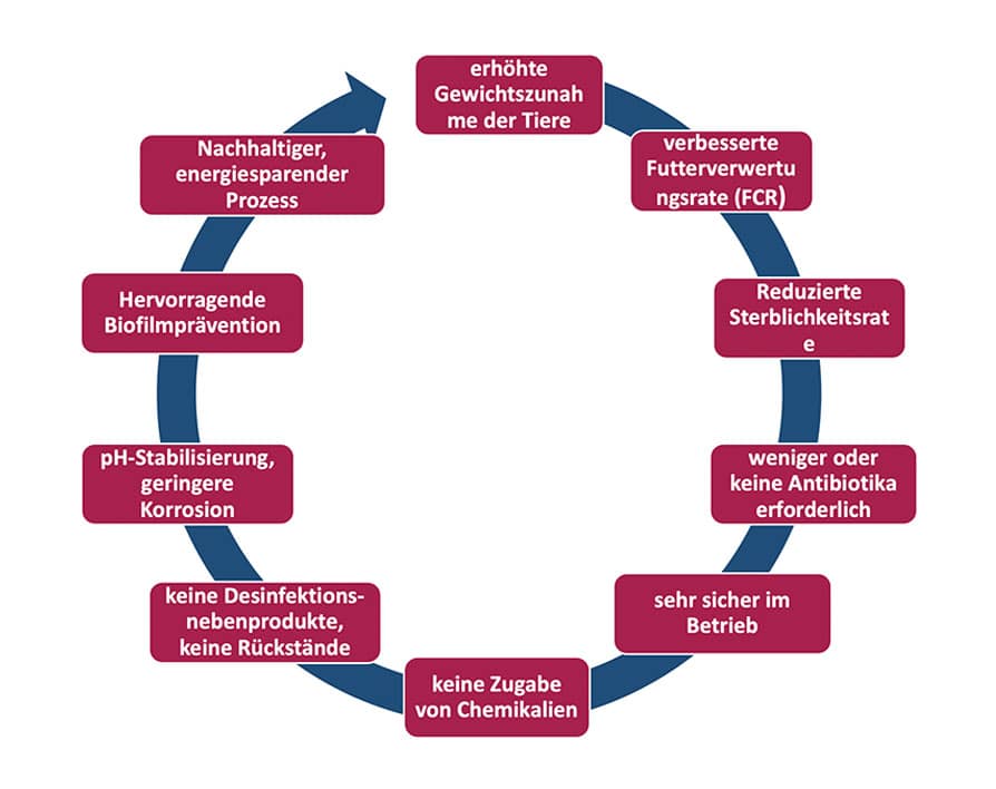 Dank dieser Technologie wird das Tränkwasser ohne oder mit stark vermindertem den Einsatz von chemischen Zusätzen oder Chlor aufbereitet, während gleichzeitig Biofilme und Verunreinigungen in Rohren und Leitungen abgebaut werden. Dies reduziert den Wartungsaufwand des Tränksystems erheblich und sorgt für eine zuverlässige, saubere Wasserversorgung.